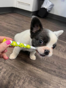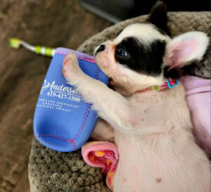 Meet our therapy dog, Ophelia! Also known as Opie, our new, fluffy, in-office French Bulldog is here to bring comfort to patients of all ages. Our gentle furry friend loves to keep patients company in the dentist’s chair to promote a calm, pleasant dental experience.